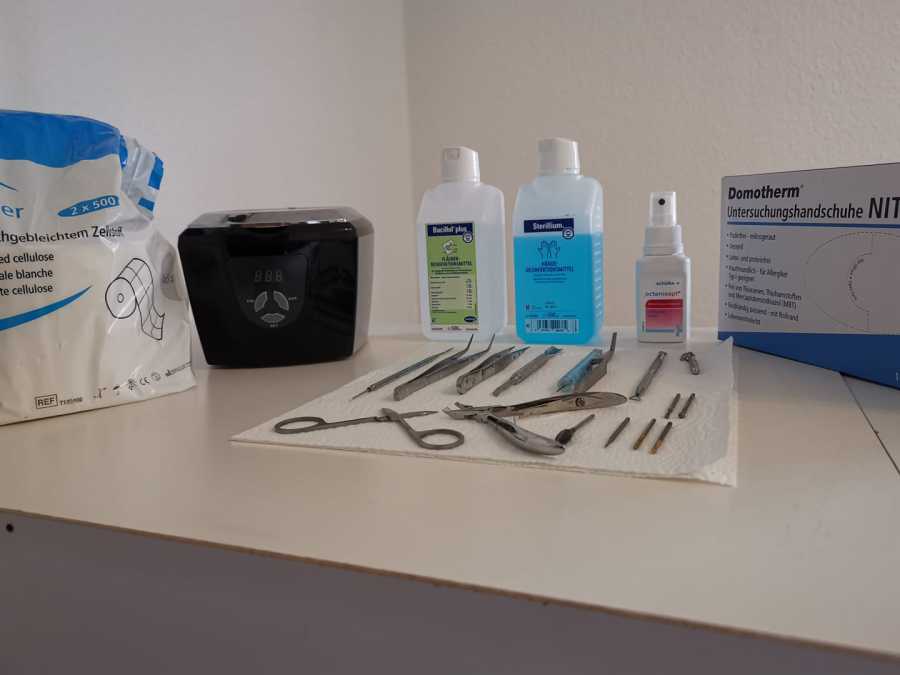 Die Instrumente werden ebenfalls Ultraschall gereinigt und mit Instrumentendesifektionsmittel behandelt.
