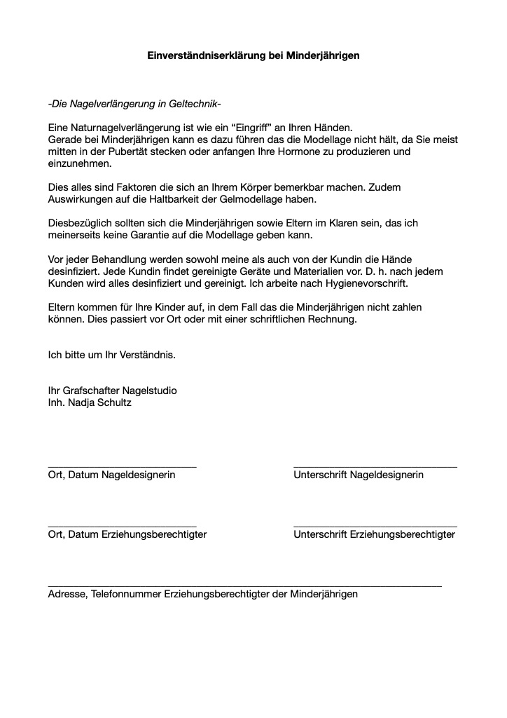 Generell gilt, künstliche Modellagen werde ich nur bei volljährigen Kunden Dienst leisten. Unter Einverstädnis der Eltern bzw des Erziehungsberechtigten können Modellagen schon ab 16 Jahren gemacht werden.